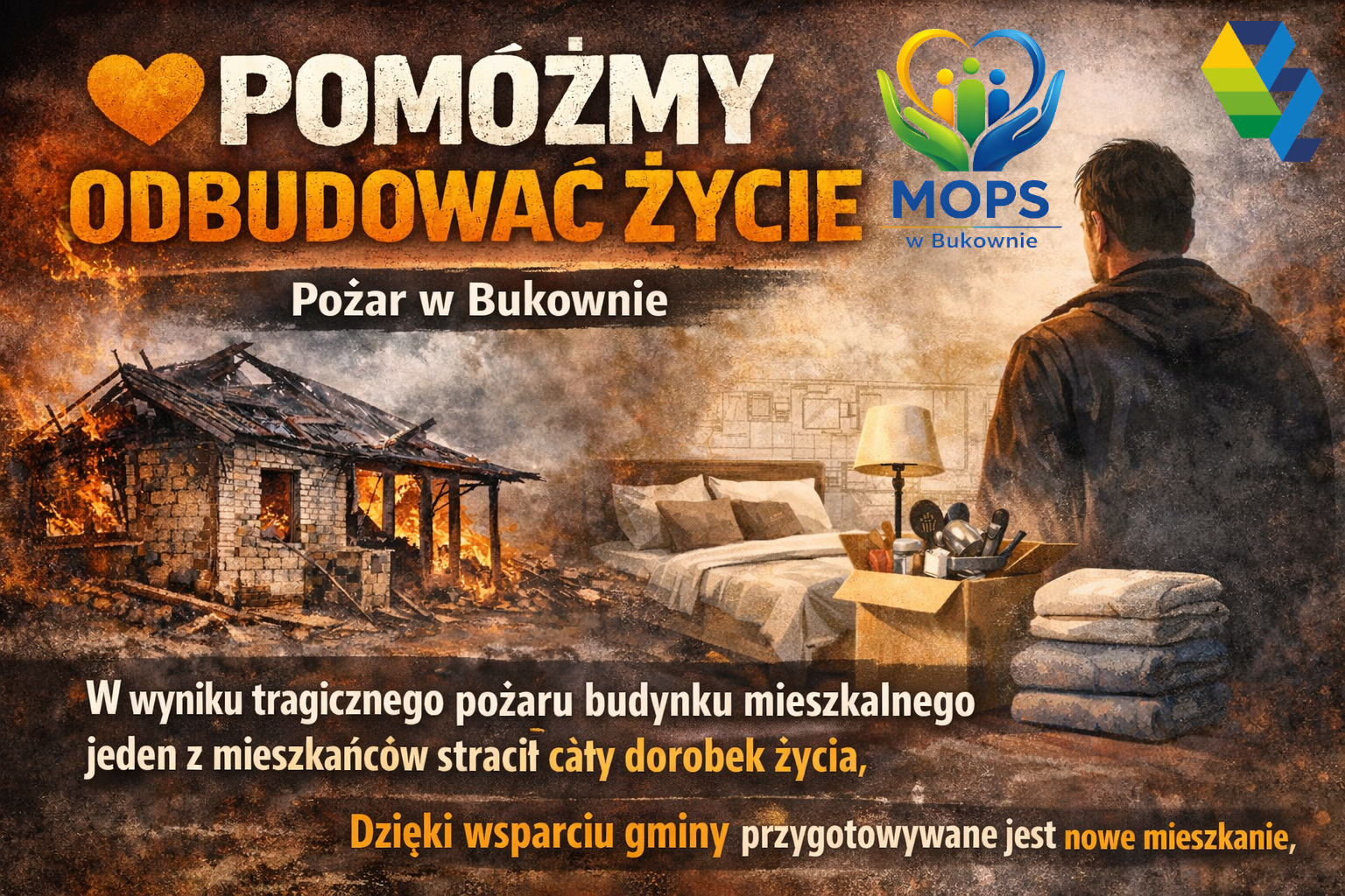 PILNIE POTRZEBNA POMOC !!! W dniu 14.04.2026r. W miejscowości Bukowno doszło do pożaru w budynku mieszkalnym na skutek czego Pan stracił dorobek życia. Dlatego też potrzebne jest wyposażenie mieszkania, które gmina przygotowuje do zamieszkania dla Pana :